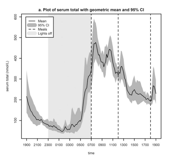 Most people treat adrenal insufficiency with man made replacements for what their bodies would normally produce. This chart shows the levels of Cortisol through a 24hour period in a normal group of healthy adult males. Remember we are all different and age, gender and metabolism can make a difference.